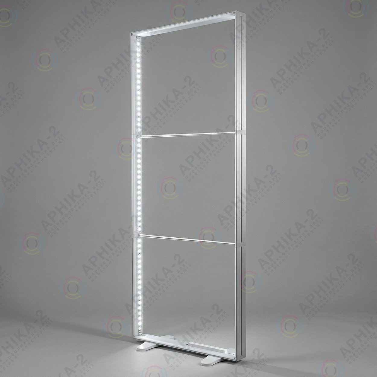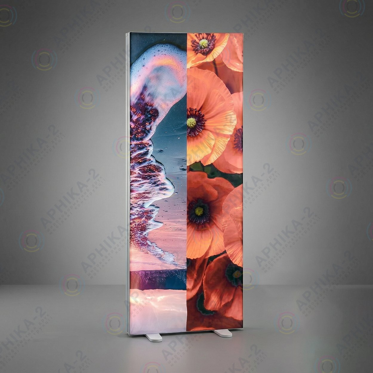 Размер 100×250 см обеспечивает отличную видимость даже на расстоянии. Тканевое полотно создаёт ровную поверхность без бликов, а равномерная внутренняя подсветка делает картинку насыщенной, глубокой и максимально выразительной. Благодаря этому лайтбокс мгновенно привлекает внимание на выставках, в торговых центрах, на презентациях, маркетах и любых других мероприятиях.
