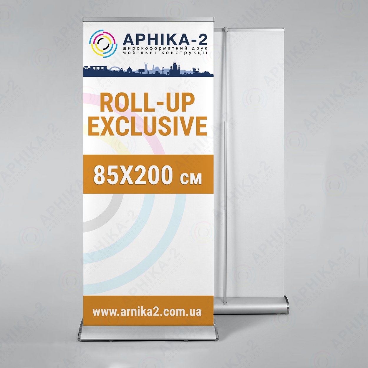 Докладніше про конструкцію Roll-up exclusive 85х200 можна прочитати на сторінці – Стенди рол-ап ексклюзив, а вивчити весь асортимент мобільних конструкцій типу рол-ап можна в категорії – Стенди рол-ап.